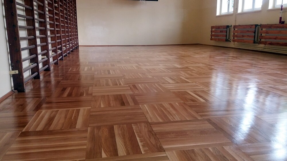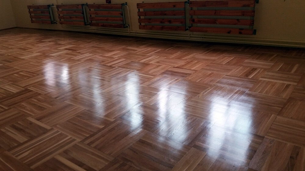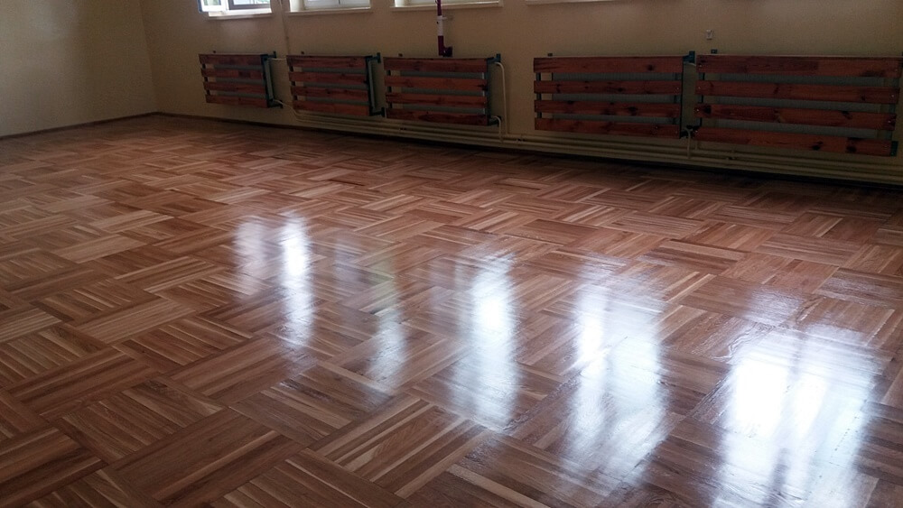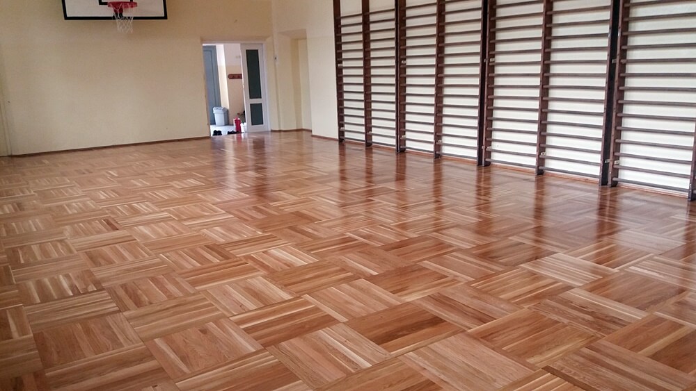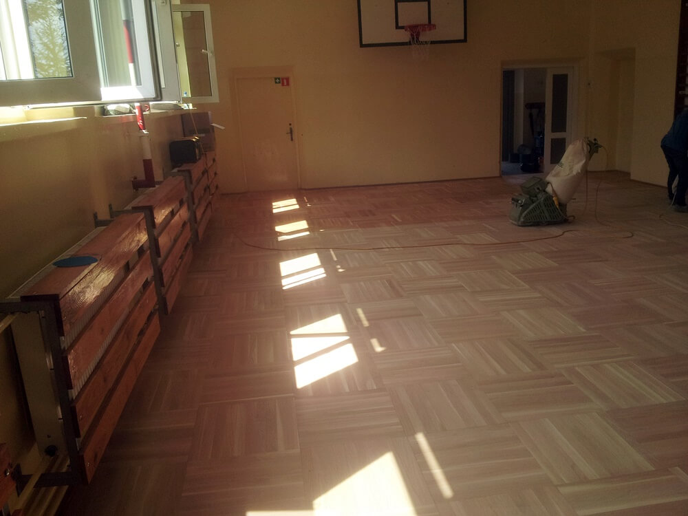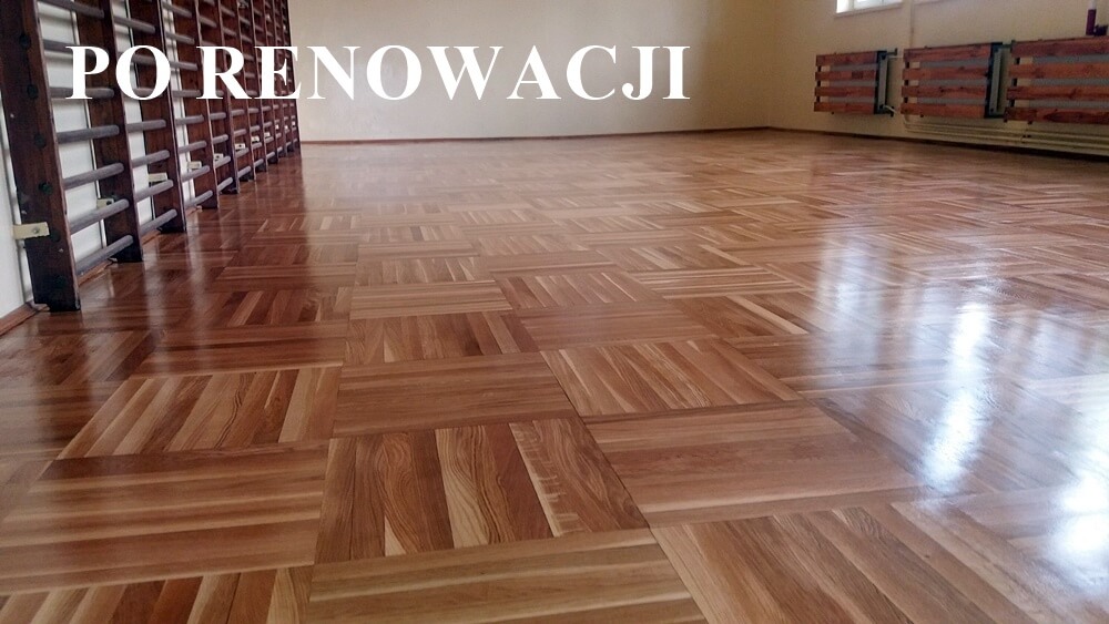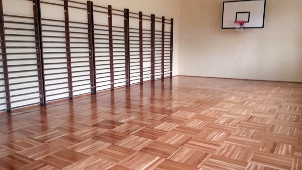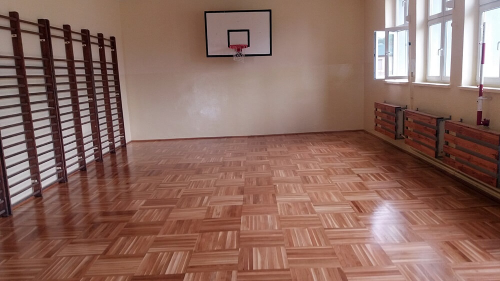 Renowacja sali  gimnastycznej polegała na  cyklinowaniu parkietu, szpachlowaniu ubytków oraz lakierowaniu całej powierzchni lakierem chemoutwardzalnym w aspekcie Połysk.
