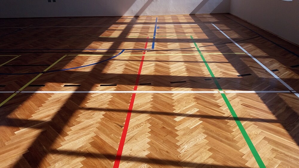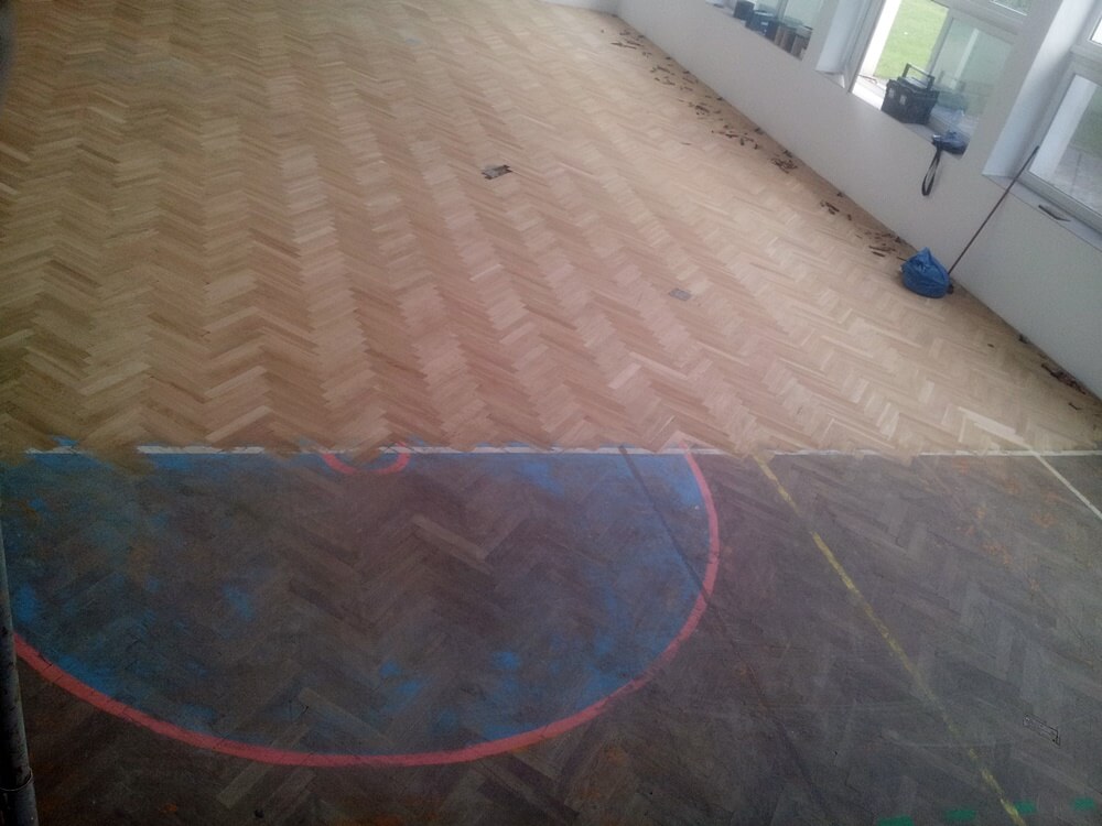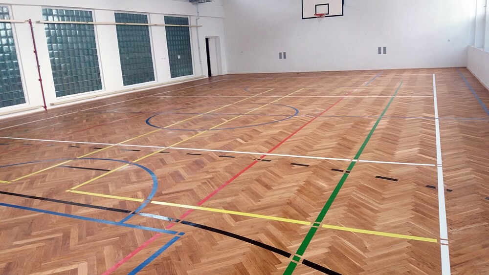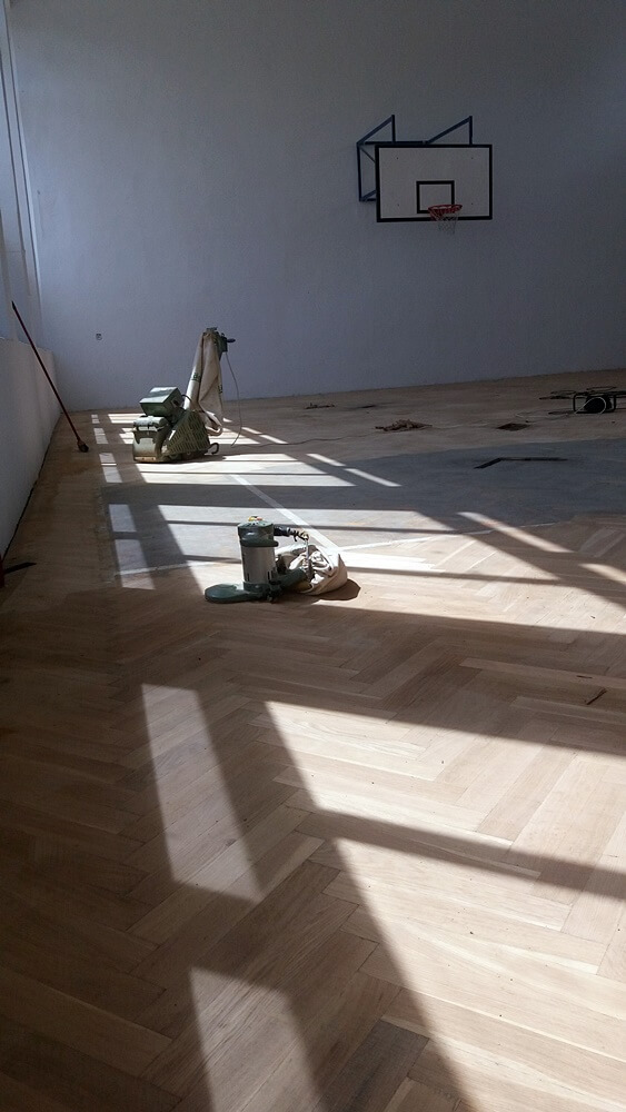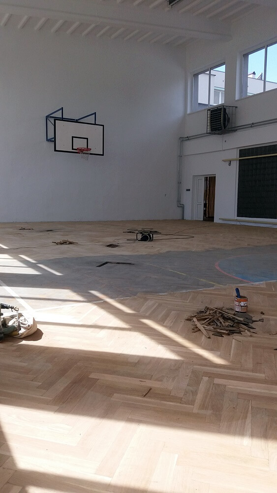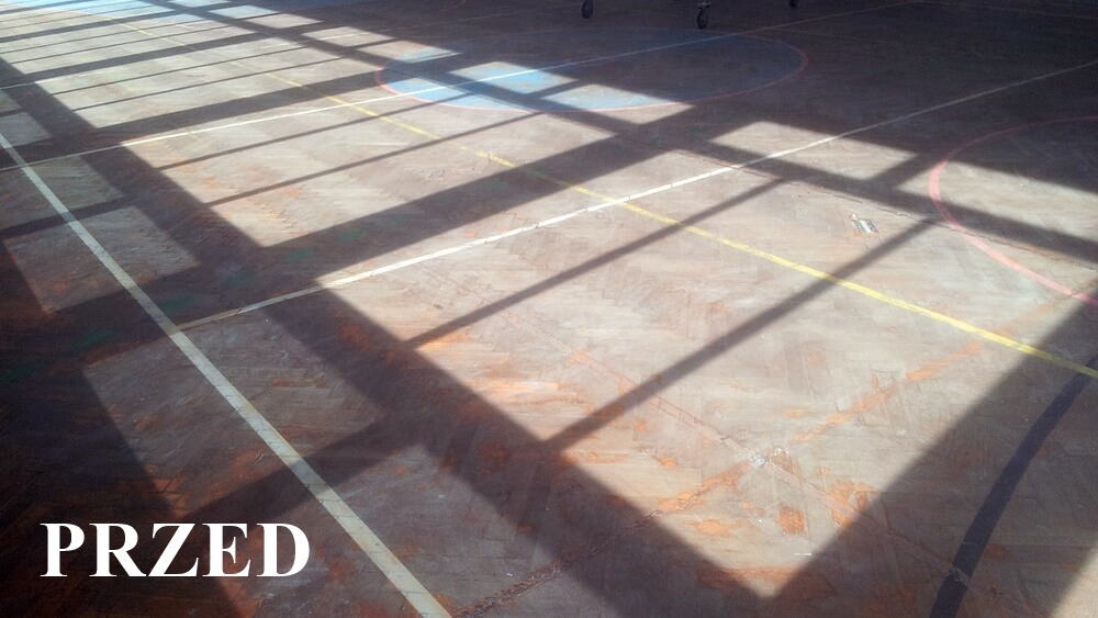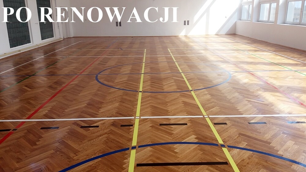 Galeria przedstawia zdjęcia renowacji szkolnej sali gimnastycznej podczas której wyrównaliśmy i wyczyściliśmy parkiet poprzez cyklinowanie, naprawiliśmy uszkodzone klepki oraz zlikwidowaliśmy niepotrzebne podciągi. Namalowaliśmy boiska do: koszykówki, siatkówki, 3 boiska do mini siatkówki oraz główne linie do piłki ręcznej. Następnie cała podłoga została pokryta lakierem chemicznym poliuretanowym.