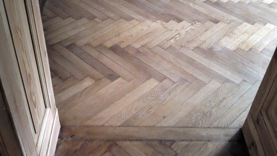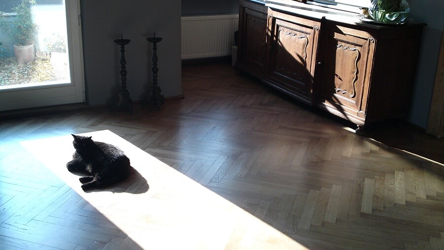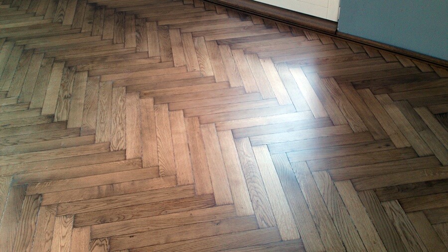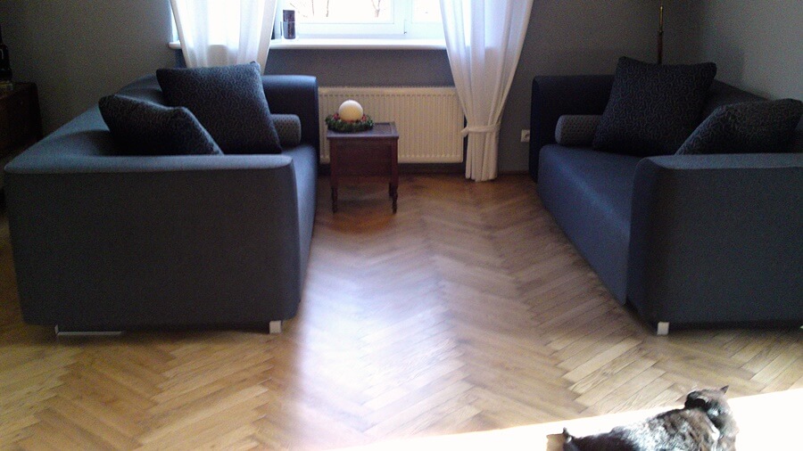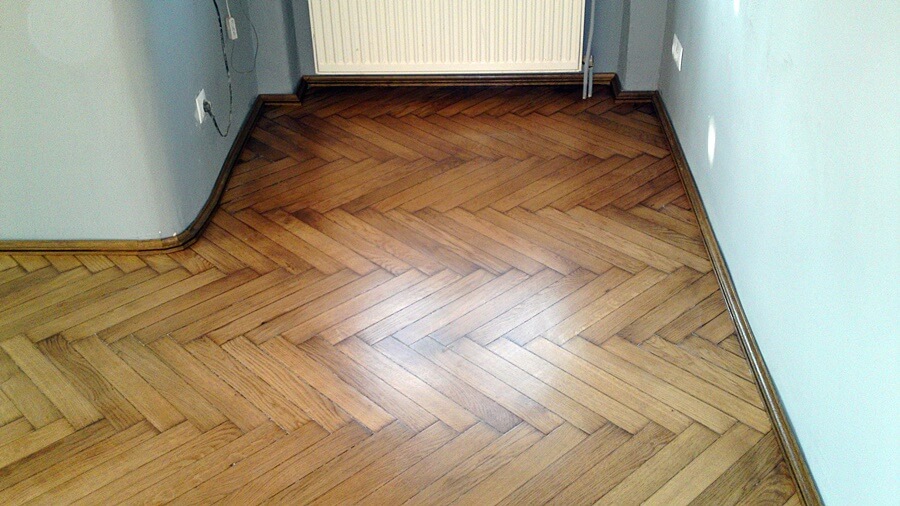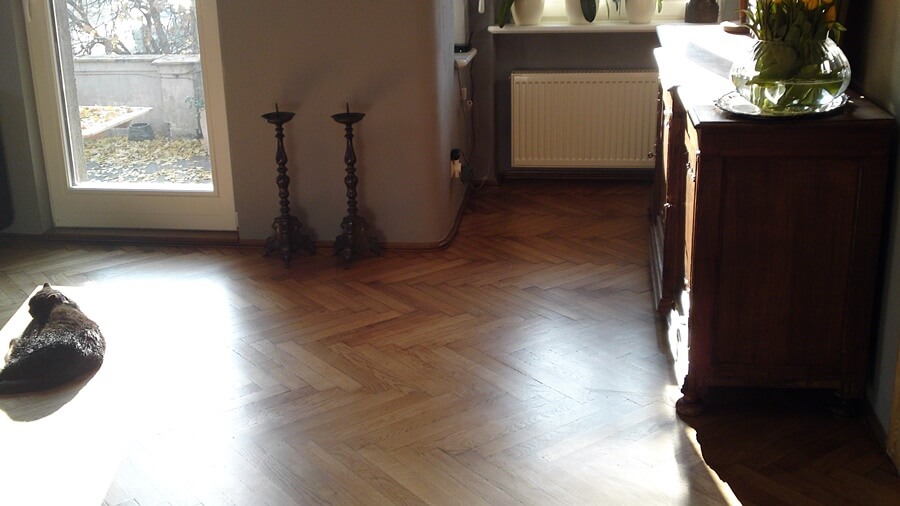 Galeria przedstawia zdjęcia odnowionej starej podłogi drewnianej – parkietu dębowego ułożonego wzorem ”jodełka”. Wykonano cyklinowanie bezpyłowe, szpachlowanie oraz lakierowanie przy użyciu lakierów rozpuszczalnikowych – poliuretanowych.