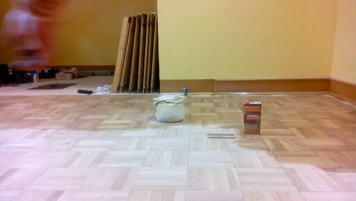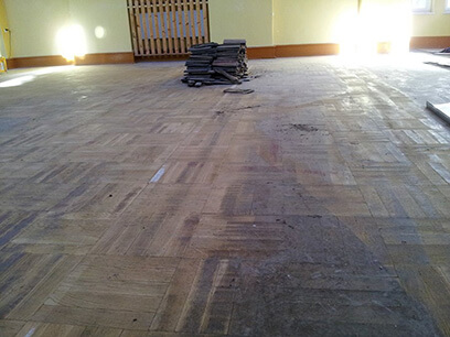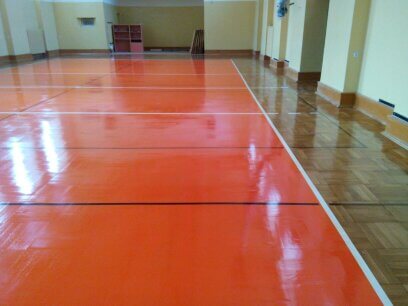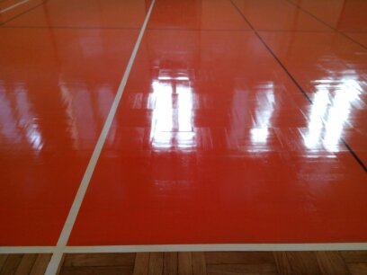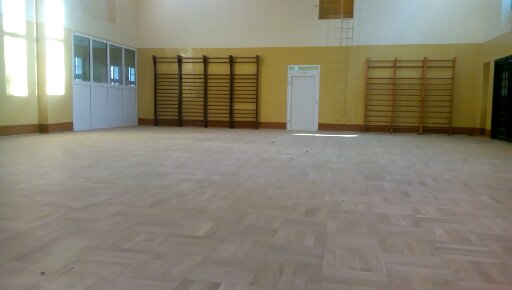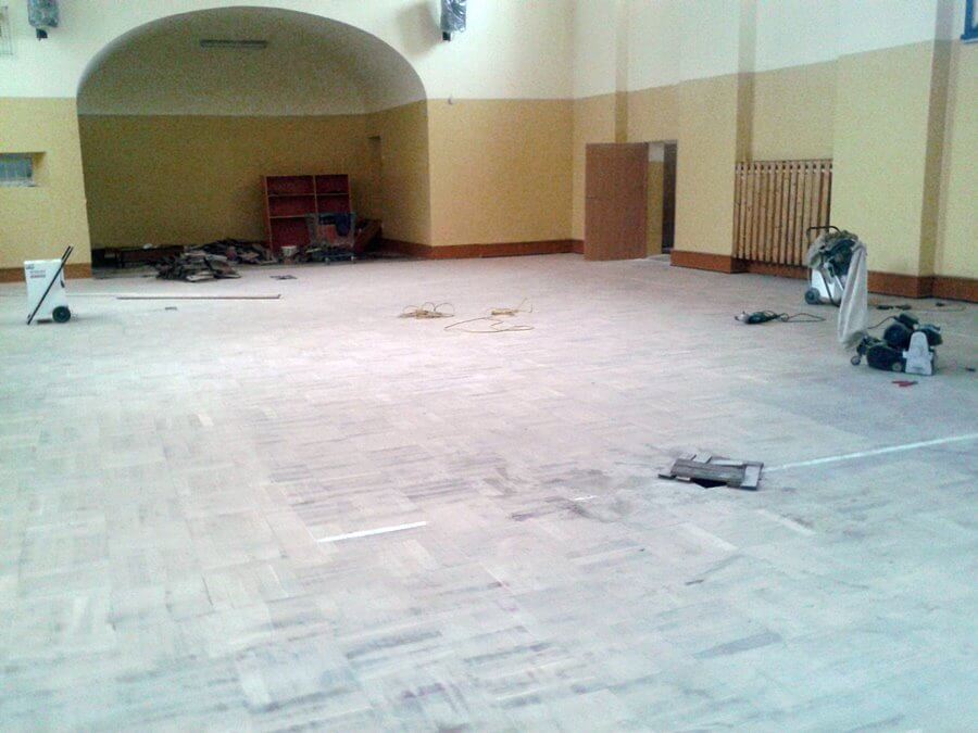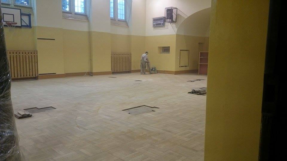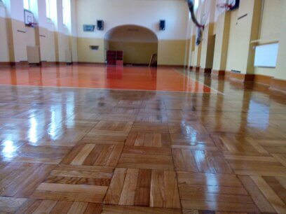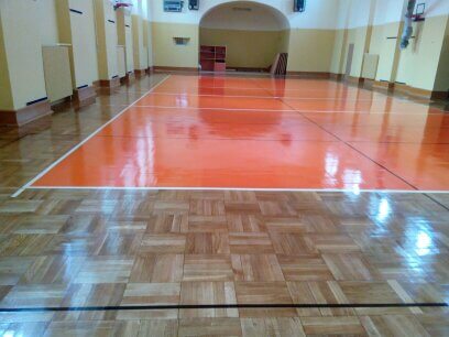 Zakres prac: naprawa parkietu, cyklinowanie parkietu, malowanie linii boiskowych, lakierowanie podłogi.